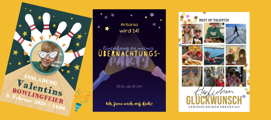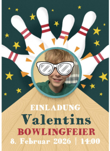 Sobald sich mein bald 12-Jähriger entschieden hat, lasse ich die Einladungen in der Anzahl seiner Gäste drucken. Schaut links, die Bowling-Einladung konnte ich mit einem Foto von ihm personalisieren.